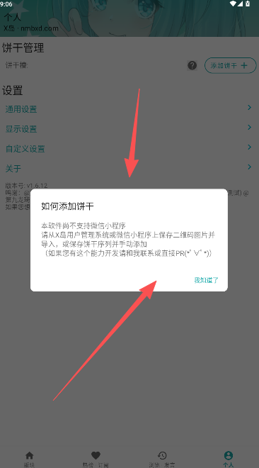1、点击切换至黎明岛K个人页,点击添加饼干旁边的?符号。