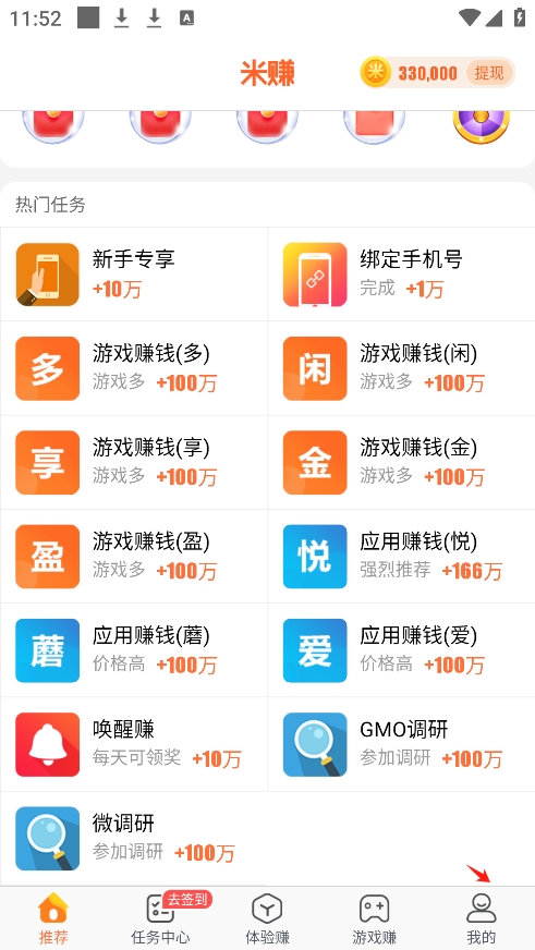 1、打开米赚app,点击我的页面。