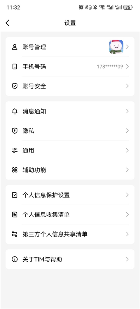 启动TIM应用,进入"我的"页面,点击右上角的设置图标