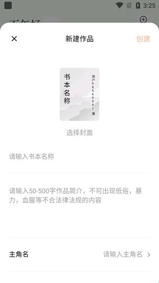 3、按照提示填写作品的基本信息,包括书名、作品介绍、主要角色名称以及目标读者群体等,确认信息无误后点击“创建”按钮,即可成功发布您的作品。