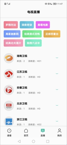 3、切换到直播功能,能够观看各大电视媒体的频道内容;