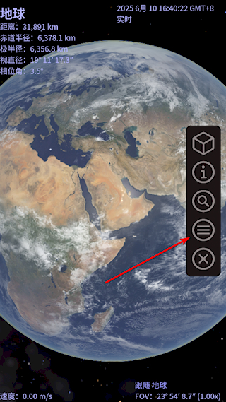 1、打开超光速遨游宇宙APP后,点击右侧的三横按钮