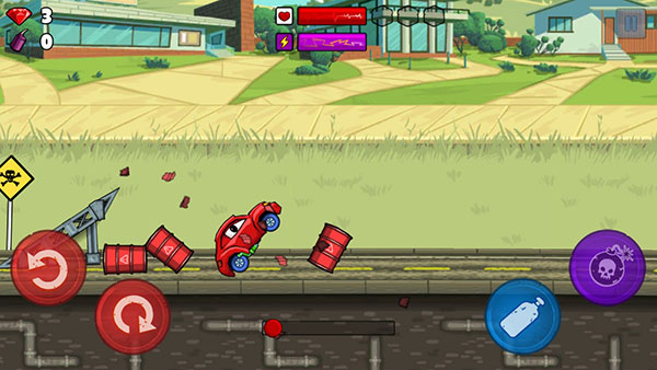 通过虚拟摇杆控制赛车移动,在高速行驶中避开路障、陷阱与敌方攻击,同时收集沿途金币用于性能升级。