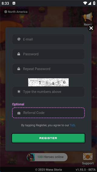 2、填写邮箱、密码(需重复确认)、验证码,推荐码选填,最后点击"REGISTER"完成注册