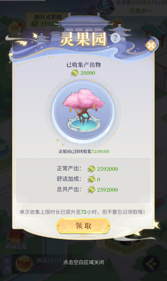 灵果在灵果园获取,灵果园会自动生产灵果资源,等级越高产出效率越高,灵果园累计灵果时间具有最高累计上限,超过上限则不会进行累加,需要及时进行领取。获取后在灵兽园通过鞭策灵兽打工而消耗。