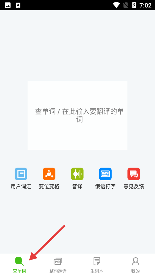 1、打开应用界面后默认进入查单词界面,在白色背景中央设有输入框用于查询俄语单词,底部提供词汇变位变格等实用功能按钮