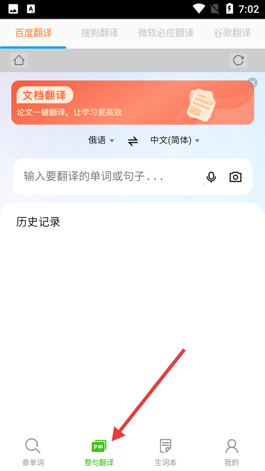 2、整句翻译功能整合多个翻译平台,顶部显示百度翻译等选项,中部可自由选择翻译语种,支持文档翻译,底部保留历史查询记录