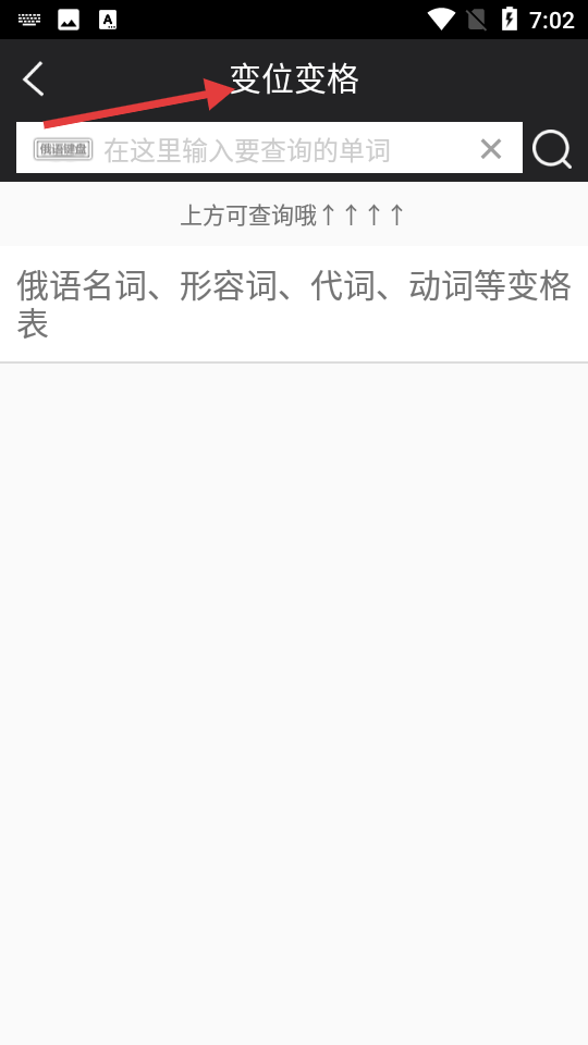3、变位变格查询页面顶部设有返回键,输入框可输入俄语单词查询,下方明确提示可查询名词、形容词等俄语词汇的完整变格表