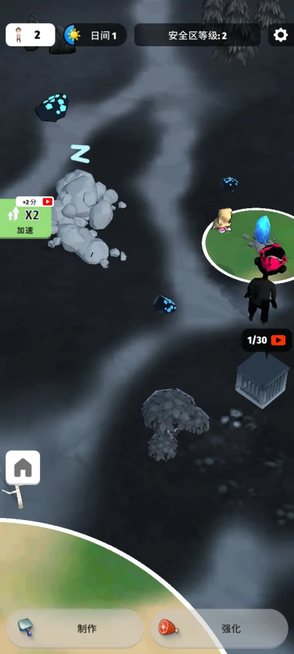 2、随着安全区等级提升,玩家可探索更广阔的区域并收集散发蓝光的稀有石块,巧妙使用“加速”功能能显著缩短资源收集与建筑升级的时间。