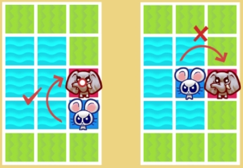 每只动物每回合可以向横向或纵向移动一格。老鼠是唯一可以进入小河的动物。