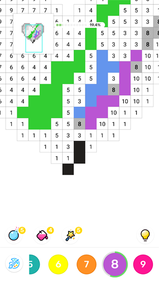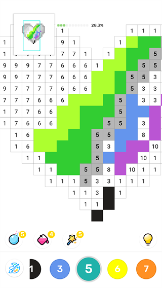 油漆桶、魔法棒、提示等道具提升填色效率。