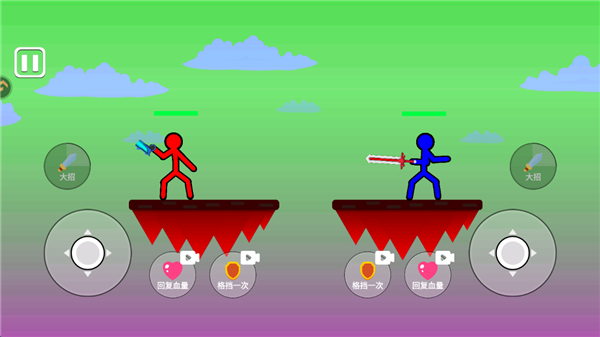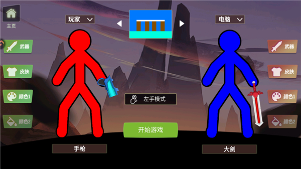 2、双方玩家可分别选择自己喜欢的火柴人角色、武器装备及个性化皮肤