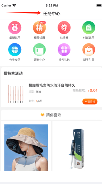 2、切换至任务中心界面,包含最新试用活动、模特展示任务等板块,提供优惠券领取与新手指导功能