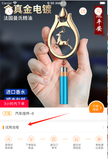 3、进入商品详情页面,查看如法国曼氏精油汽车挂件等商品信息,包含进口香料特色说明,底部附有完整试用申请流程