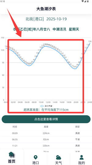 2、首页直观展示北街港等主要港口的潮汐曲线图,清晰呈现水位变化趋势与涨落潮时间。