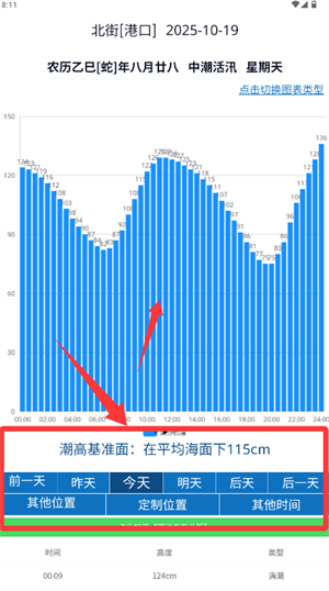 3、点击图表区域可切换多种显示模式,支持查看潮高基准面或选择特定日期查询历史与未来潮汐数据。