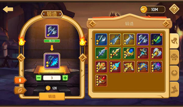 装备分为武器、护具、饰品、战靴四大部件,均可在锻造之家进行升级。升级要求为三件相同装备熔合升级为一件更高级装备,同时消耗一定数量金币。