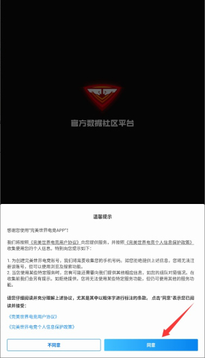 1、首次打开完美世界电竞应用时,请仔细阅读用户协议与隐私政策,点击同意按钮后即可进入应用主界面。