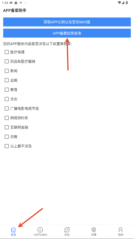 1、启动APP备案助手应用程序,在主界面选择"备案"功能模块,点击"备案结果查询"进入官方查询平台。