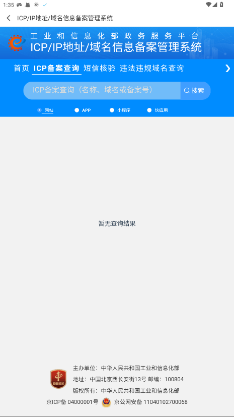 2、系统将跳转至工信部官方备案查询平台,输入需要查询的APP名称或备案号即可获取详细的备案状态信息。