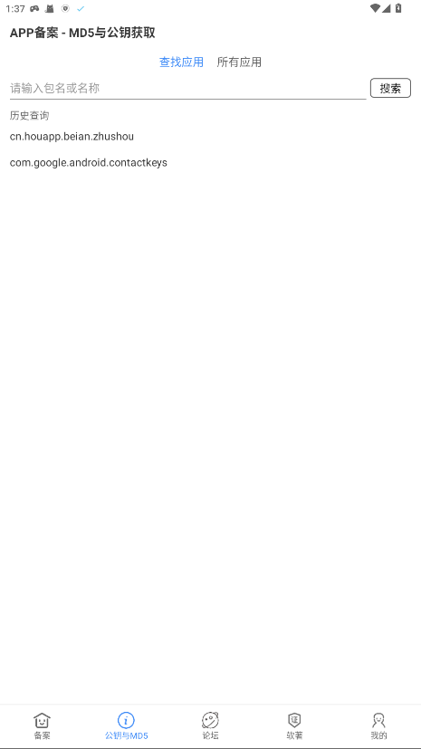 3、返回主界面选择"公钥与MD5"功能模块,输入目标APP的包名或应用名称,系统将自动检索并显示相关应用的签名信息。