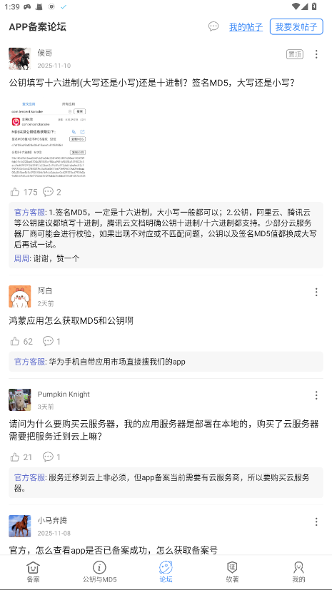 5、进入"论坛"模块可以浏览其他开发者的经验分享,也可提出自己在备案过程中遇到的问题,获得社区支持。