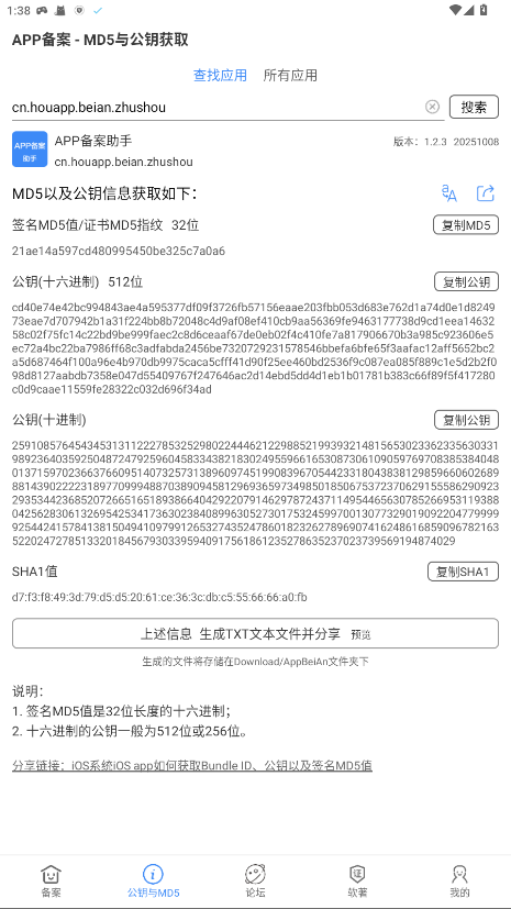 4、查询完成后,系统会清晰展示该APP的公钥信息和MD5指纹值,这些是备案过程中必须填写的重要参数。