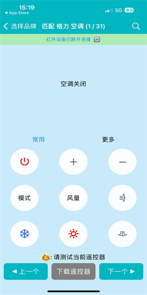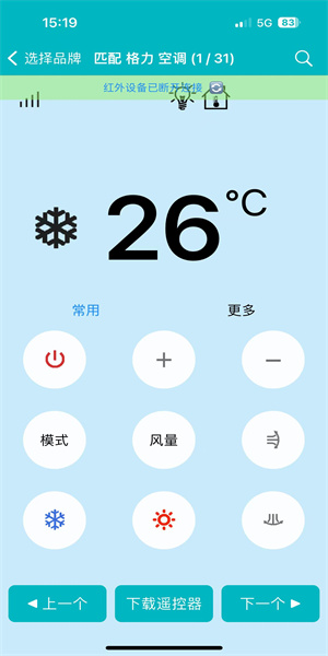 悦风空调遥控器免费版APP(改名格力+)由珠海格力电器股份有限公司开发打造,能将智能手机转变为通用遥控设备。软件主要用于控制格力品牌及旗下悦风等系列空调产品,利用Wi-Fi或红外传输技术建立连接,完成温度调节、运行模式切换等操作。软件的界面设计参照实体遥控器按键排布,结合语音指令识别与场景化设置功能,为用户打造便捷的家电控制体验。
