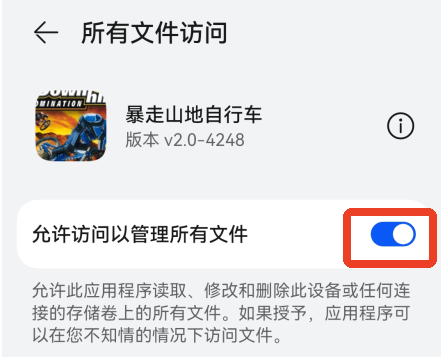 2、在系统权限管理界面开启【允许访问所有文件】的授权选项,确保金手指功能可以正常调用游戏数据。