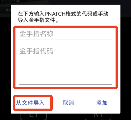 6、如需使用自定义代码,可点击【添加金手指】功能手动输入或导入本地保存的作弊代码。