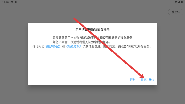 1、易途导游报账app启动提示,要求用户同意协议才能使用服务,提供拒绝和同意并继续选项。
