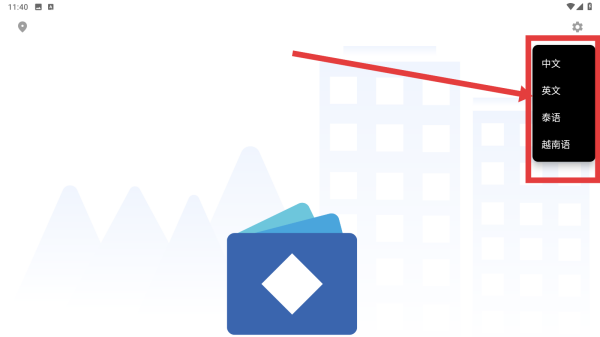 3、易途导游报账app语言选择界面,提供中文、英文、泰语、越南语选项,方便不同语言用户使用。