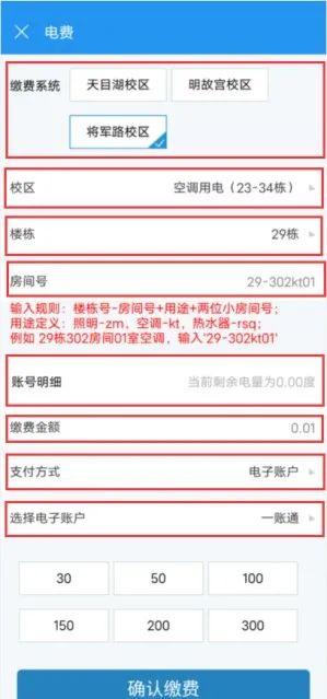 4、请根据实际情况填写对应信息:校区、楼栋、房间号以及充值金额,具体可参考下图;