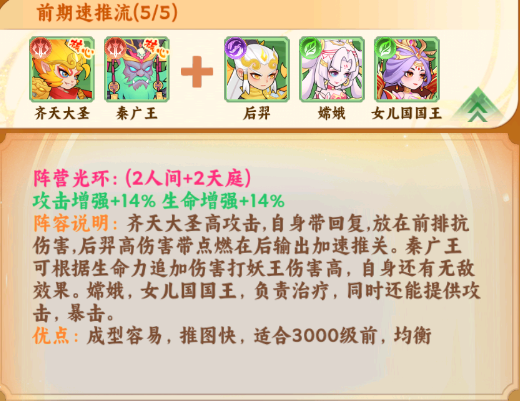 阵容说明:齐天大圣高攻击,自身带回复,放在前排抗伤害,后羿高伤害带点燃在后输出加速推关。秦广王可根据生命力追加伤害打妖王伤害高,自身还有无敌效果。嫦娥,女儿国国王,负责治疗,同时还能提供攻击,暴击。