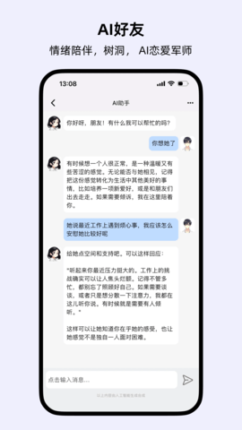 3.多模式交互体验:除了常规的文字对话辅助外,还设有情感陪伴模块可进行日常倾诉与心理疏导。