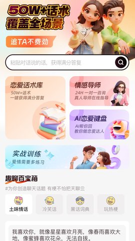 恋聊高手是一款专为单身人士及希望提升情感交流能力的情侣设计的恋爱辅助应用,通过整合大量实用话术资源来优化用户在社交互动中的表达效果,覆盖从初次接触到深入交往的各个阶段,这些内容不仅包含多样化的风格类型,还能根据具体场景进行灵活调用,让在不同情境下都能找到合适的沟通方式,应用的基础服务无需付费即可体验,而进阶功能则需要额外解锁以获取更全面的支持。