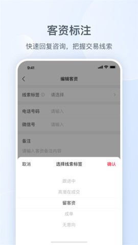 4.线索标注与跟进:与客户交流后,根据其意向强度(如高意向、需培育、已成交)为其添加标签,并可在备注中记录关键信息,便于后续制定差异化的跟进计划。