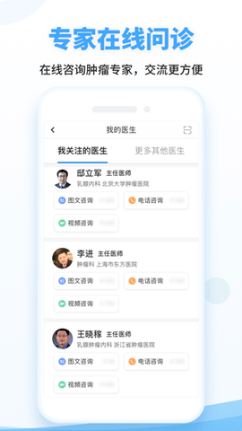 4.预约专家在线咨询服务:通过找专家功能筛选医院、科室、职称等条件,查看医生简介与可预约时段,选择图文、电话或视频问诊方式并支付费用后,即可在预约时间与专家进行线上沟通,咨询后可查看电子版咨询小结。