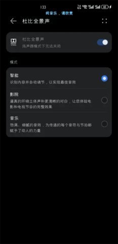 2.选择情景模式:开启杜比全景声后,点击进入其设置界面,这里会提供智能、电影、音乐、游戏等预设模式,根据你正在进行的活动选择对应的模式,软件会自动配置最佳音效参数。