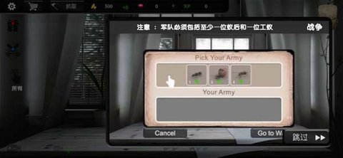 4.遭遇其他昆虫或敌对蚁群时,可通过点击选中蚂蚁单位,并划动屏幕指引们进行围攻或撤退。