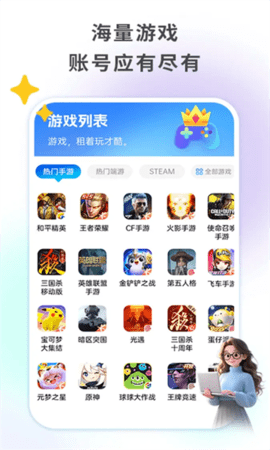 1.平台构建了一个涵盖主流端游与移动端游戏的庞大账号库,资源更新紧跟市场热点。
