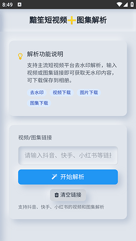 2.进行单条内容解析:复制目标视频或图集的分享链接,将其粘贴至主界面的输入框内,点击解析按钮,稍等片刻即可预览并下载无水印内容至手机相册。