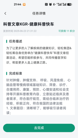 4.学术任务参与流程:在成长板块中可查看当前开放的科普征文或病例讨论任务,按照要求提交内容后,可在积分中心查看奖励与反馈。