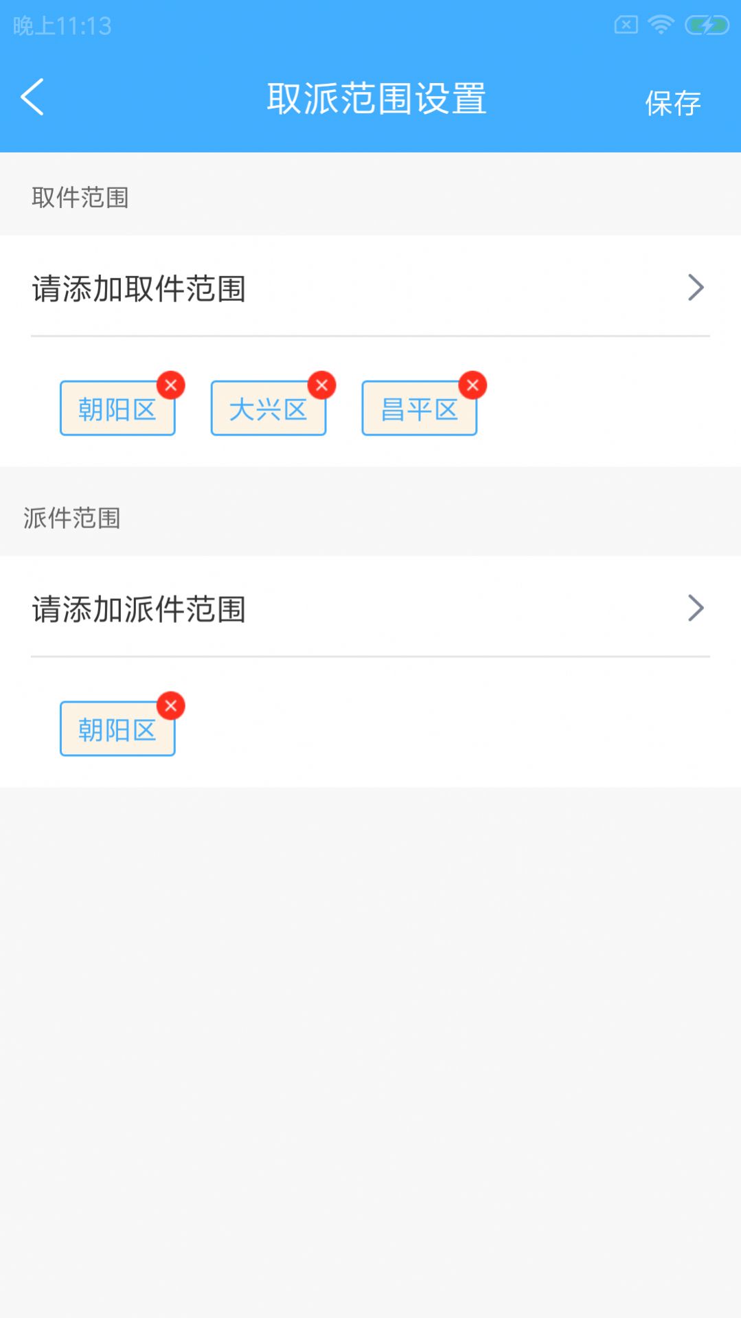 5.数据查看与范围管理:快递员可在统计页面查看每日的工作数据图表,在设置中,还可以根据实际派送区域,自定义并保存常用的服务范围。