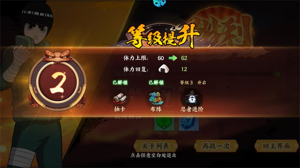 4、完成关卡挑战能获得资源奖励,同时提升忍者等级,等级达标后会解锁更多新玩法。