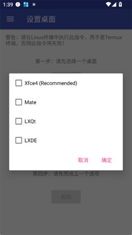2.用户只需在软件内选择好目标发行版,复制生成的命令到Termux中执行,整个部署过程便自动完成。