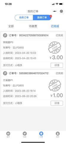 4.查看历史记录:在订单页面中,可以按时间筛选查看所有历史停车记录,包括入场时间、地点、时长和费用明细,并可以申请开具电子发票。