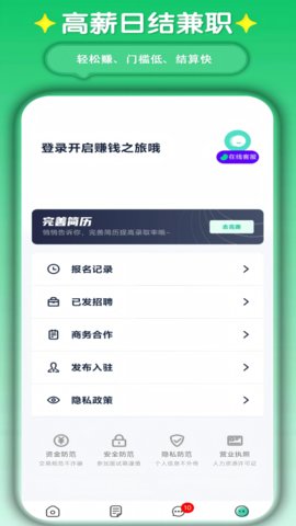 2.创建个人简历:在我的简历板块,详细填写工作经验、技能特长、可工作时间等信息并保存。