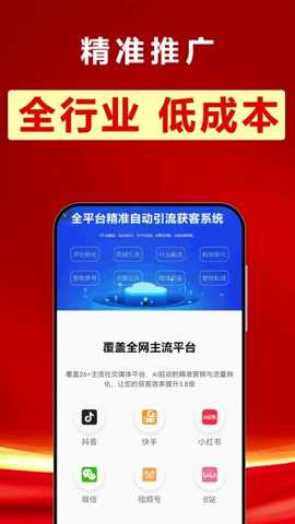 精准推广是一款专为企业营销场景打造的自动化获客工具,能够有效解决企业在多个主流社交平台寻找潜在客户的难题,显著提升线索收集与业务拓展的效率,软件整合了智能投放与数据分析能力,让营销动作更加有的放矢。
