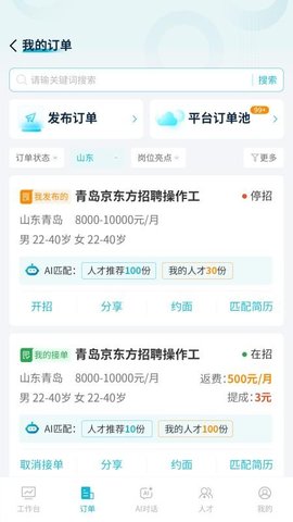 1.软件代理招聘场景,为劳务公司与招聘代理设计了专属的发单、接单与佣金结算管理体系。